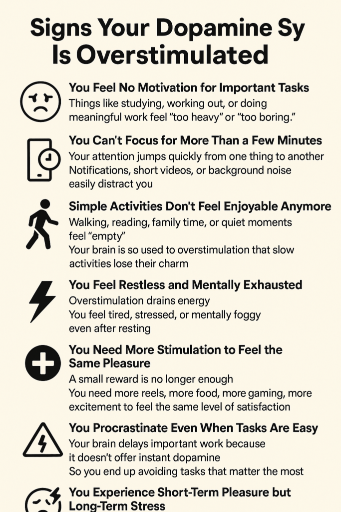 When the level of dopamine is high in your brain due to fast, high-reward activities like scrolling, junk food, gaming, or constant notifications, your brain becomes overstimulated and starts responding only to intense stimulation. Over time, this excess dopamine creates negative effects in your daily life and makes it harder to reset your brain naturally.