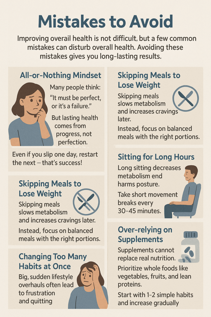 Improving overall health is not difficult but a few common mistakes can disturb overall health.Avoiding these common mistakes you can remove errors and give you long lasting results.